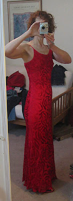 I've had this dress forever. I bought it years ago, wore it I don't even remember where even though I shouldn't have because I was too heavy & pear-shaped for it, gained even more weight and couldn't fit into it, held onto it because the color is so gorgeous and the fabric is so nice, and then, even after I was thin enough to wear it again, never took it out of the closet because it's floor-length. I know patio dresses are all the rage right now, but I'm already oooooooover that look and besides, the fabric of this is too dressy for it to be long and casual.